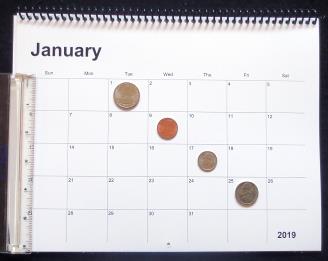 Representative large calendar with coins and ruler to show relative size of the grid boxes |